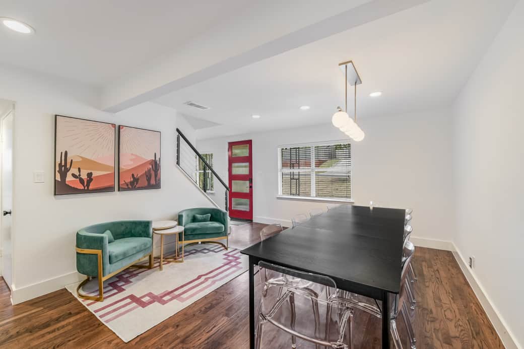 Expansive sectional, vibrant art, and midcentury touches set the stage for your Austin getaway.